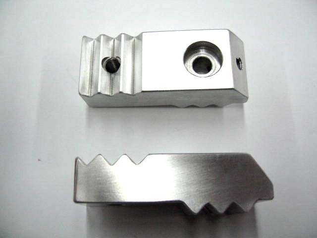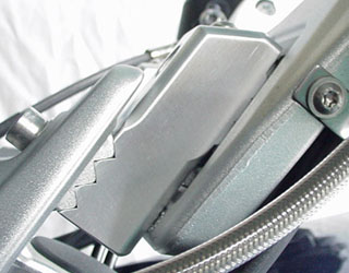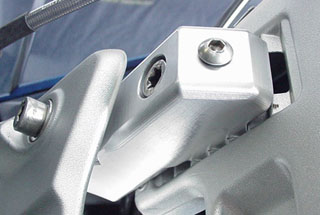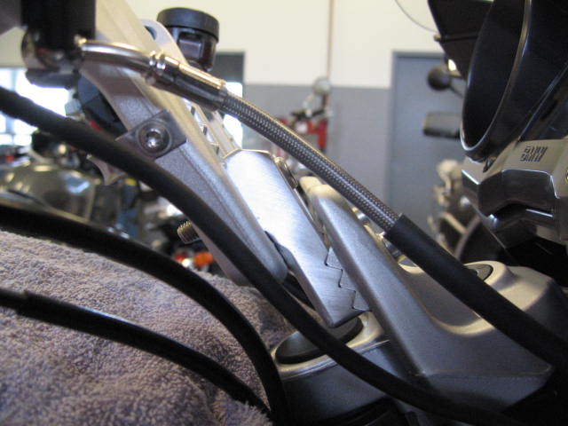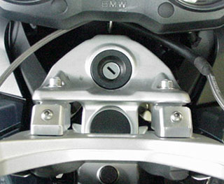 Installation instructions: 7-10-2009 This is a two person job (4 hands). You will need padding to protect the gas tank bodywork. Two thick bath towels will do. Torx tools are required to do anything on the new BMWs. A 6mm Allen is needed for our bolts. The kit includes two M8x35 bolts, two 6mm button head bolts, two stainless washers and two aluminum adapters. On the back side of the handlebars is a black plastic cover held on by two Torx screws. There are two fragile plastic fingers on the front side of the cover that help guide it into position during assembly. Remove this cover to gain access to the hardware that holds the bars to the steering top plate. On both the left and right side of the steering head top plate there are two metal tabs that hold wiring in place. To move the handlebar to a new position the wires must be removed from behind the tabs to provide enough slack. A little wiggling can usually get the wires free from the tabs. The handlebar attachment bolts thread into "T" nuts that fit in a slot in the back surface of the handlebar. This "T" nut and Torx bolt will be reused, but the cap nut, spring and folded sheet metal plate will NOT be used. Remove the cap nut using a 13mm wrench or socket. Loosen the M8 Torx bolts. The "T" nut and other hardware will fall free as you remove the M8 bolts. The spring can easily fall into the bodywork and be lost forever, try to avoid this. Let the HB rest on the padding. -------- First attach our adapters to the top plate using our M8 Allen head bolts together with the BMW factory washers. See the picture at right. Tighten to 20 Newton meters or 15 -16 foot pounds. There are five possible positions to fit the upper handlebar to the adapters. The highest will give approximately 1.5" diagonally up and back (45 degrees) from the factory position. Attach the HB to the adapters using the BMW factory 8 x 45mm Torx head bolts and our flat washers. Note in the picture that the "T" Nut is reversed and the other parts are not used. This arrangement maximizes the contact area between the handlebar and adapter for maximum strength. The clutch hydraulic hose is tie wrapped to a tab on the right side of the inner fairing panel. The tie wrap must be removed to provide enough slack in the hose to turn full lock left. Use the included slippery black spiral wrap on the brake hose where it touches the steering plate. Optional: Tie wraps can be used to secure the wiring to the metal tabs in a manner that will allow turning full lock without binding. Radio Shack spiral wrap may also be useful here as well. Check throttle cables, wiring, brake and clutch hoses to make sure they do not bind at full lock left and right. The two M6 button head bolts are provided for you to attach accessories.
